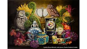 Cynthia Dinan-Mitchell crée des univers narratifs complexes par un travail d’assemblage et de juxtaposition d’objets facilement reconnaissables, mais dont la cohabitation est visuellement déroutante, voire étrange. Dans ses natures mortes, l’association d’éléments éclectiques produit un conflit perceptivo-cognitif où s’installe une tension figurative. Surréaliste ? Son travail l’est indéniablement !