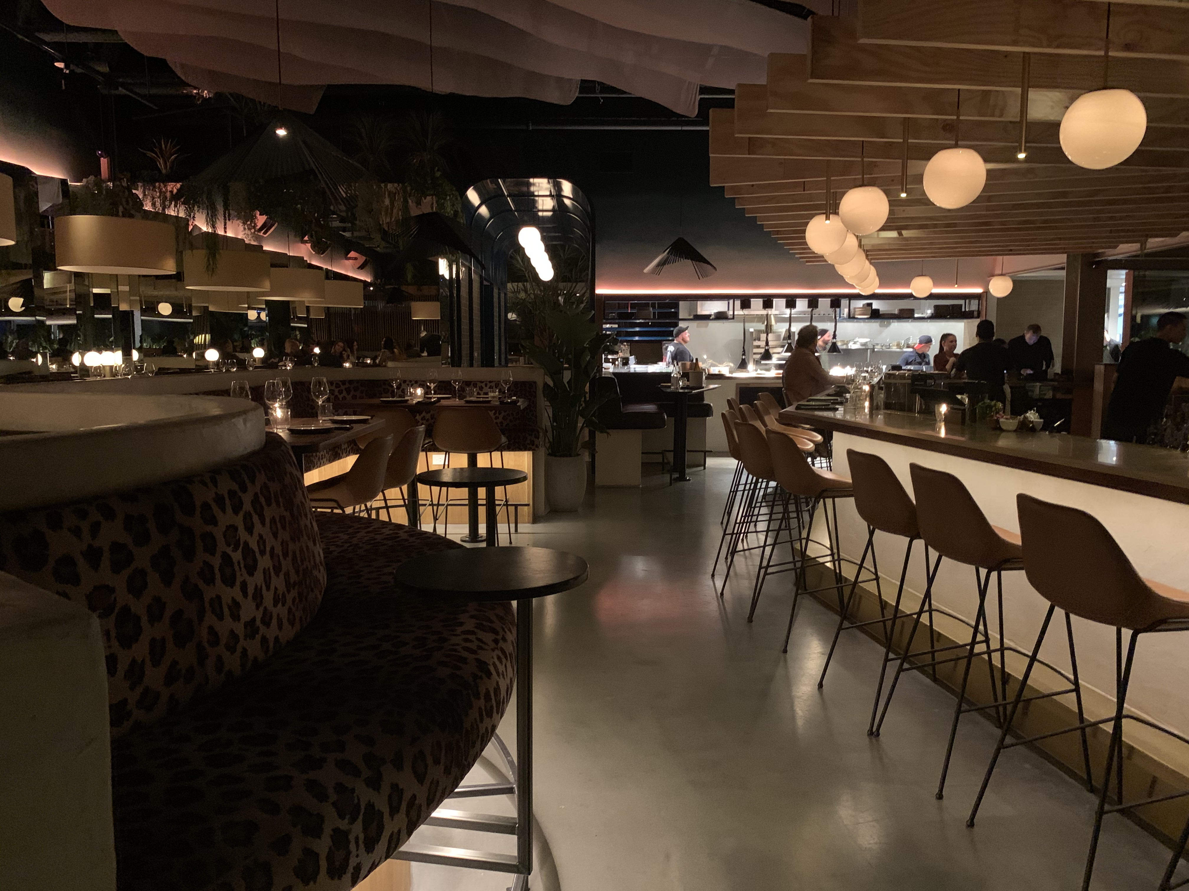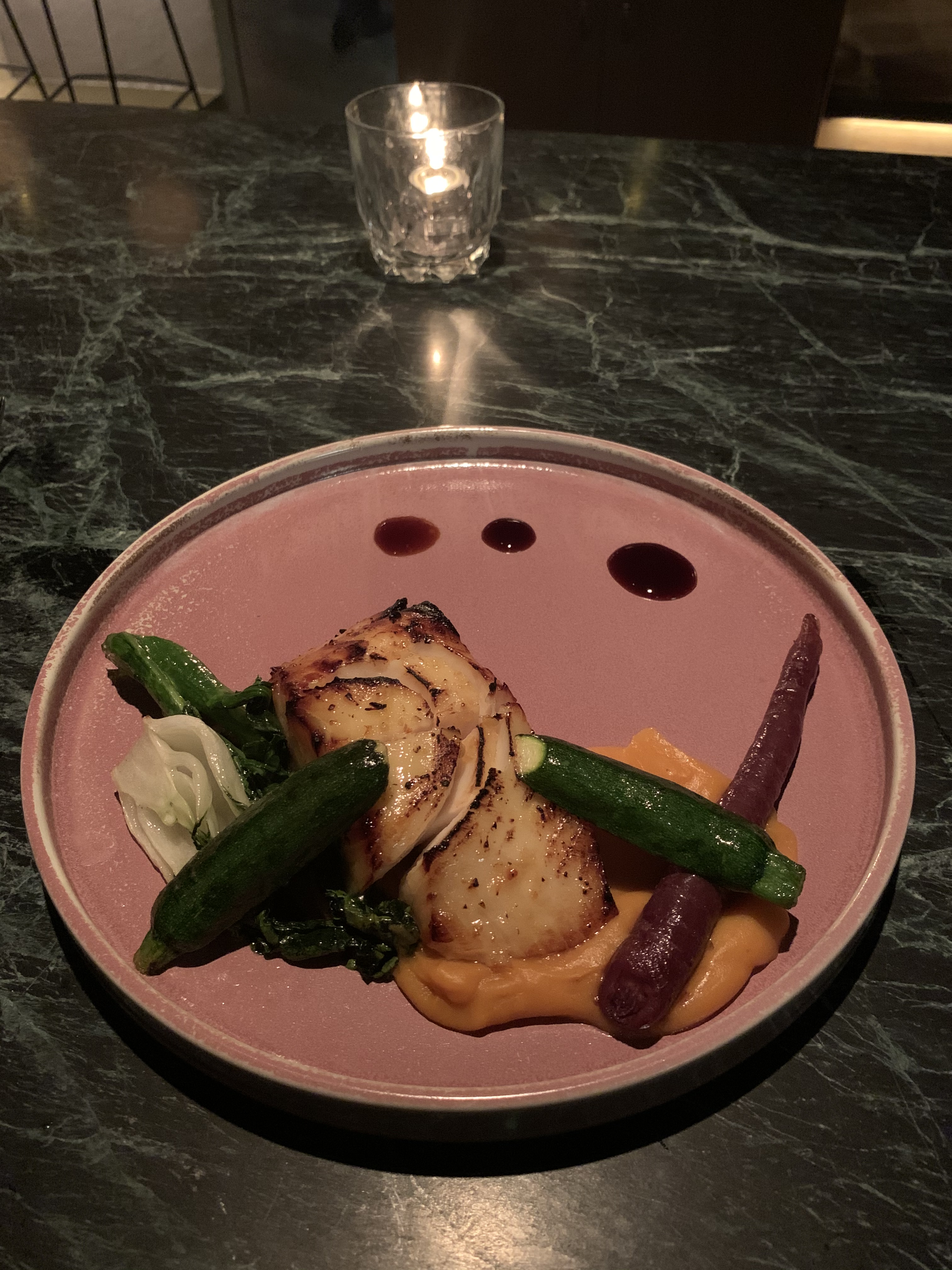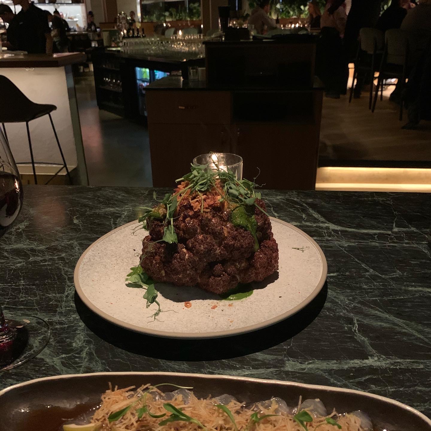 Une fois bien installés et avant de vous attaquer au repas, prenez un cocktail ou un verre de vin. Le Pinot noir 2017, malgré sa jeune vie en bouteille, est agréable à boire. Dans les entrées, le loup cru mariné au citron, nommé Suzuki, est un bon choix. Découpé en fines tranches, il est accompagné de yuzu, de zeste de citron, de gingembre et d’oignons verts. L’ensemble fond dans la bouche. Quant aux mini pailles croustillantes, elles s’accordent bien au poisson. Le plat gagnant du menu, l‘incontournable choux-fleur rôti au charbon, entouré de sa purée d’avocat et d’épinards, de shiso, très utilisé dans la cuisine japonaise et de tomatillos, de la même famille que la cerise de terre, est onctueux en surface et croquant à l’intérieur. Un vrai