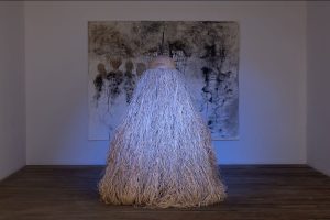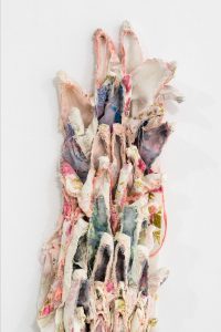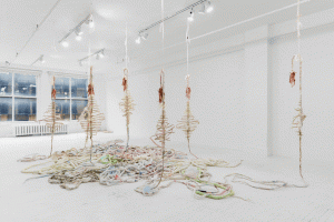 invité(e)s à déambuler au coeur d’impressionnantes sculptures textiles organiques, suspendues au plafond et éparpillées au sol, à vous laisser envelopper par l’univers enchanteur et surréaliste de l’artiste où les êtres emmêlés prennent la forme de fleurs fanées ornées de cages thoraciques. Leurs queues ou leurs racines s’amalgament au sol, formant un corps végétal chimérique, figé par l’excès de connexion.