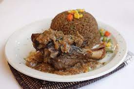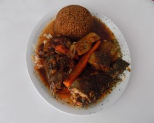 mais toujours sur un lit de plantains frits, à la place des frites, le fameux fromage en crottes surmonté d’oignons caramélisés au jus de citron. Une nouvelle manière de déguster le traditionnel venu d’ailleurs ! Concernant le Tiebou Dieune (plat national), la générosité est au rendez-vous. Alors que la nourriture arrive à vous, vos sens sont en éveille. Le loup de mer à chair blanche s’harmonise de très belle façon avec les légumes aromatisés aux épices du terroir sénégalais. Le riz blanc cassé est enduit d’huile végétale, afin de la rendre tendre, une fois lavé, il est étuvé afin d’éliminer le surplus d’huile. Sa couleur rouge est due au paprika naturel et aux tomates. Du poisson séché fait aussi partie de la recette. Les trois éléments forment la sauce