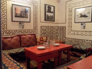 Les couples s’installent dans un cadre intime tandis que les grands groupes profitent d’un lieu où ils peuvent s’entendre dans le confort du salon marocain. Le fondateur et chef, d’origine mauritanienne, vous accueille avec sa joie-de-vivre réchauffant l’ambiance pour la soirée.