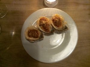 Les huîtres travaillées. Mises sur un grill quelques minutes, une fois tièdes, ouvertes et garnies d’une sauce à partir de pétoncles, de chili, de pieuvre, de soya et de prosciutto, elles sont saupoudrées d’amandes