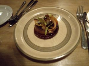 brûlés marinés dans une réduction de jus d’oignons, huile d’oignons verts (en partie grillés, mélangés à des oignons verts frais puis broyés dans l’huile, mis dans un coton à fromage et récupéré en infusion de saveurs). Le caramel sucre et attendrit l’oignon tout en le gardant légèrement croquant sous la dent, ce qui procure une sensation vraiment agréable. La pâte, elle, imbibée de jus, fond en bouche et s’accorde parfaitement avec la plante potagère, ici consommée