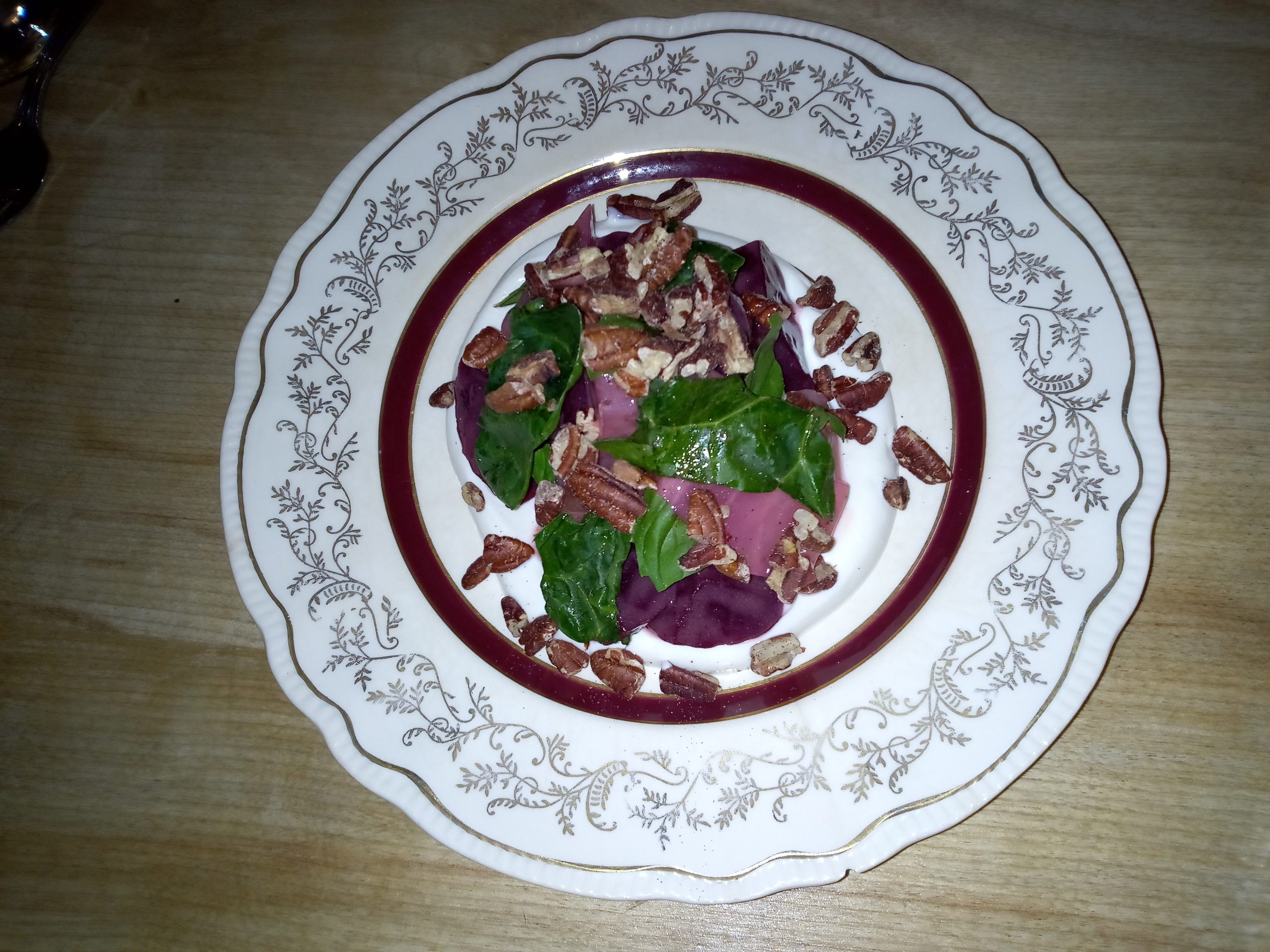 grillées. Quelle bonne idée ! Le moelleux du mollusque, son assaisonnement et le croquant des noix assurent un goût savoureux. Deux sortes de betteraves entières (les rouges traditionnelles et les Chioggia, de couleur jaune crues qui deviennent roses à la cuisson) sur un lit de yogourt à l’érable fait maison, pacanes et