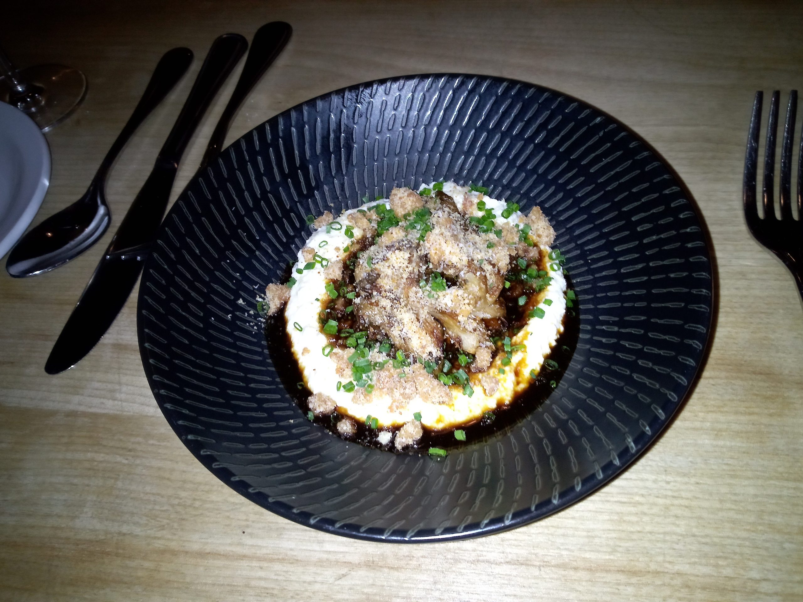 comme un légume. Généralement mal considéré, bien préparé, il est extrêmement bon. Les verts, eux, sont plus acidulés. La préparation donne un mariage intéressant. En accompagnement, les pleurotes (produit de Montréal, quartier Hochelaga), son lit de ricotta maison, jus de champignon et croustade de peau de poulet offrent une légèreté savoureuse. Excellente trouvaille gustative !