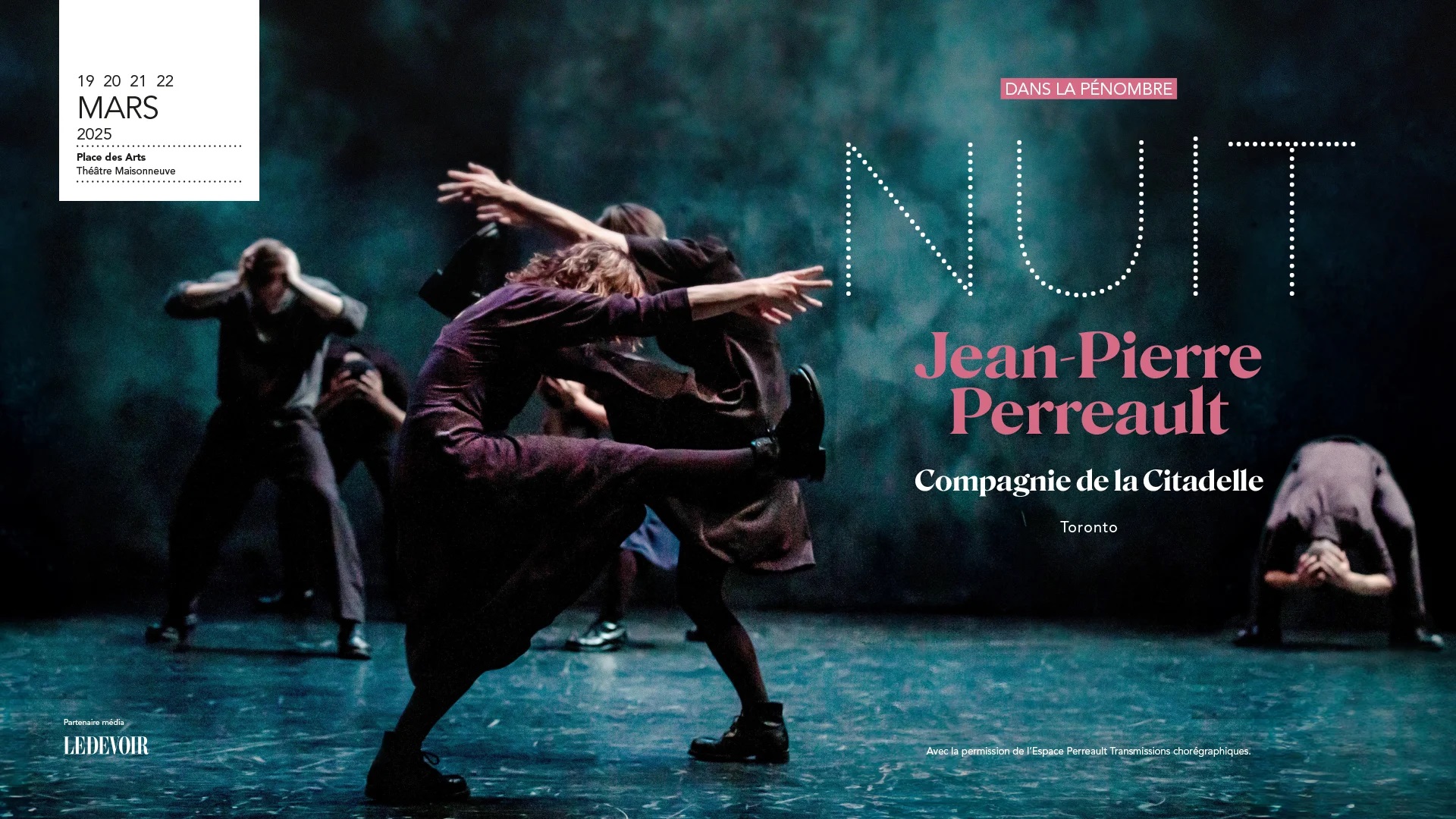 Du 19 au 22 mars, admirablement dansée par une distribution hors pair, Nuit ouvre une fenêtre sur le legs du regretté chorégraphe Jean-Pierre Perreault. Dans la pénombre, huit personnages martèlent le sol jusqu’à l’épuisement. Aux prises avec les aléas du quotidien, ils dansent la solitude, la confrontation, la fragilité. Recréée dans sa forme originelle, à l’initiative de Laurence Lemieux (qui l’a dansée en 2002) et de sa Compagnie de la Citadelle, ce spectacle exprime une vulnérabilité aussi troublante que souterraine.