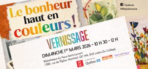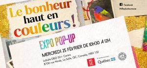 Mercredi 25 février de 10h30 à 12 heures. Exposition pop-up. Le temps d’une matinée, les œuvres seront exposées dans le cadre du Bonheur haut en couleurs. (1)